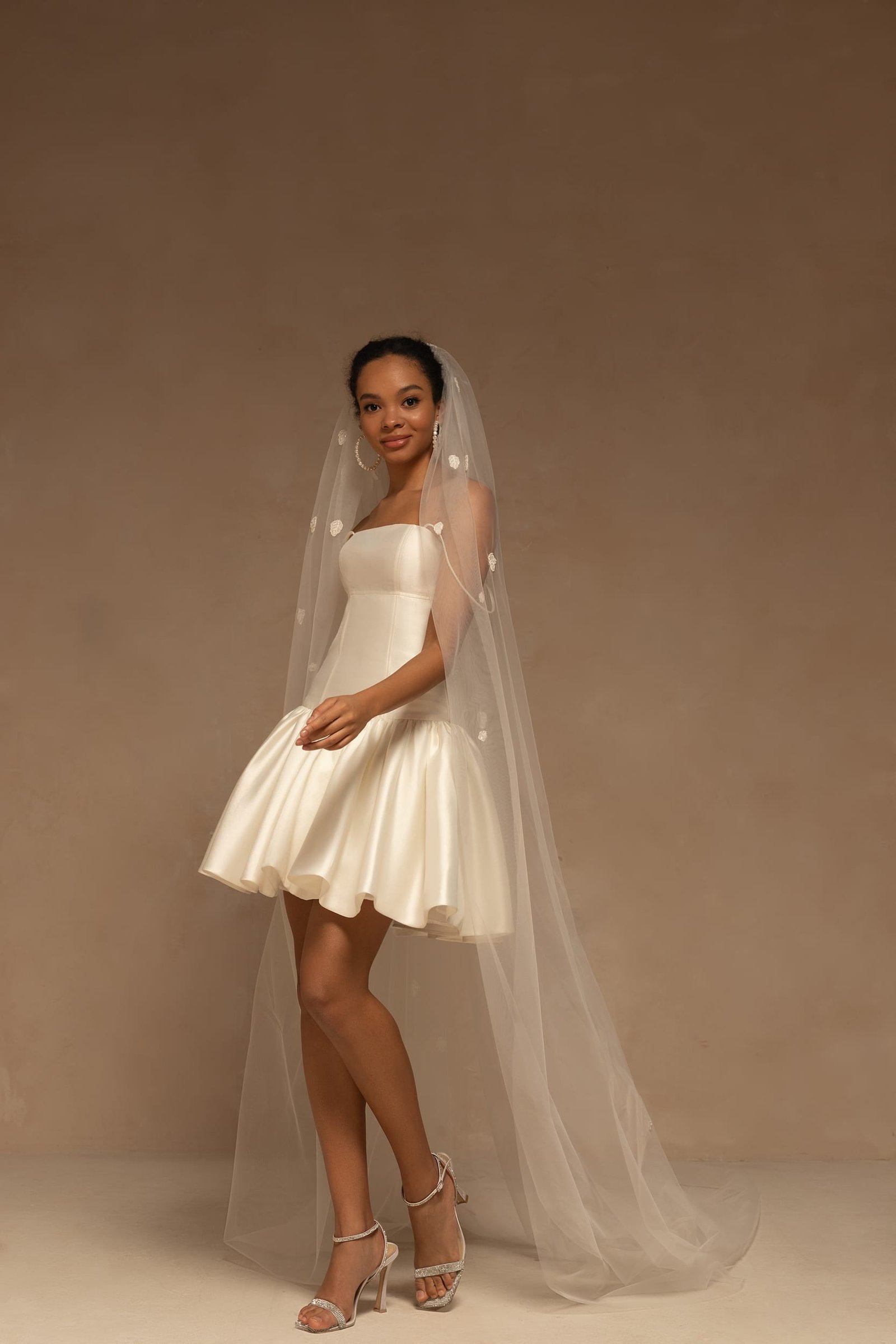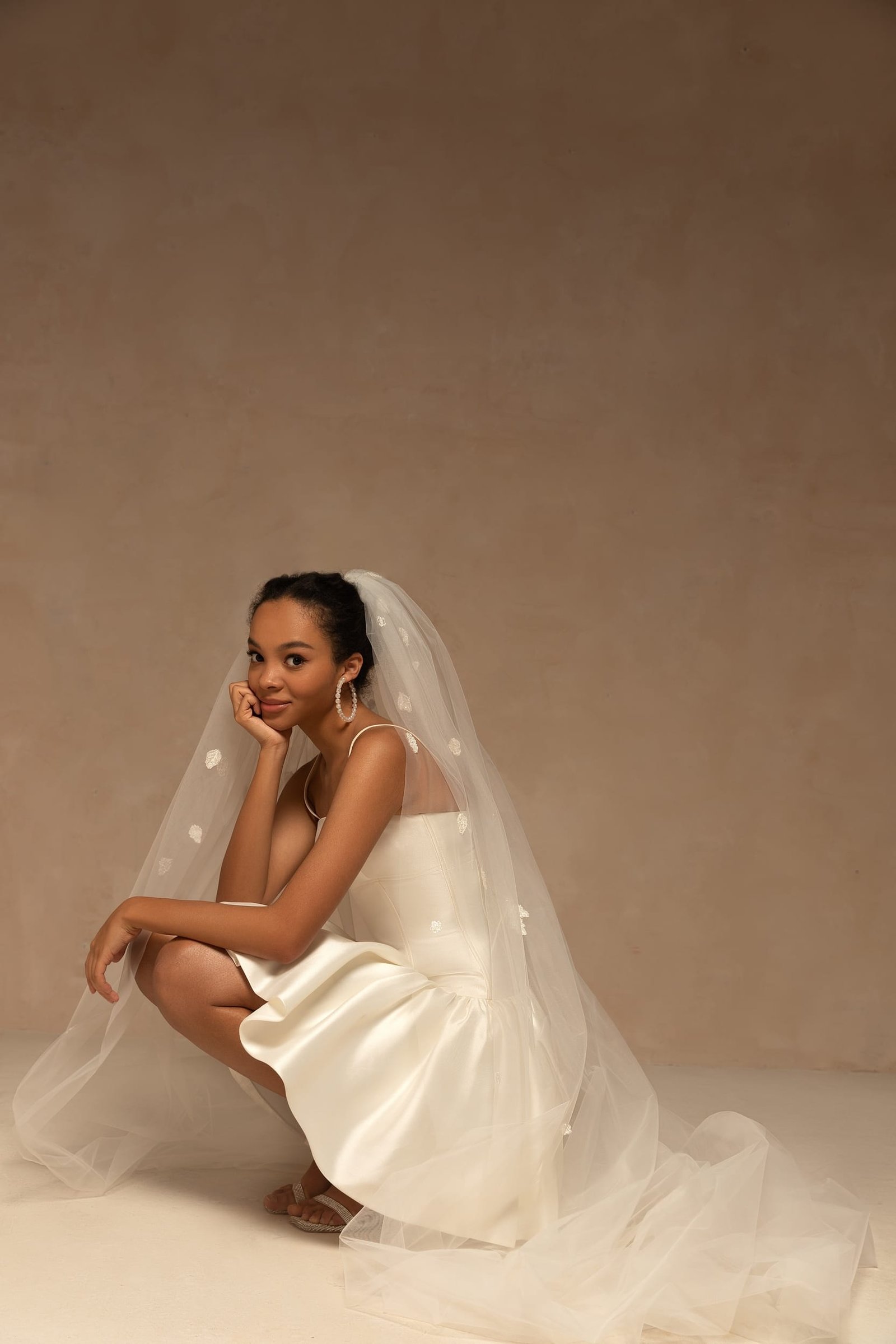 Stylish minimalistic single-tier veil made of tulle and decorated with small beaded appliques through all length. Available in cathedral length.