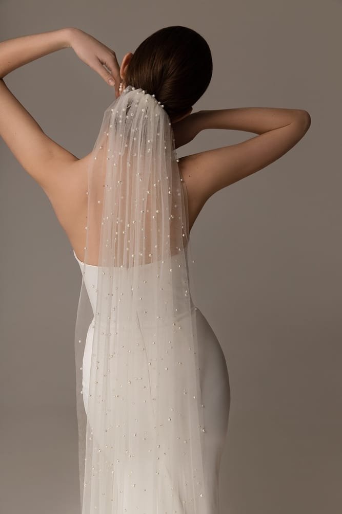Beautiful minimalistic single-tier bridal veil made of tulle and decorated with small artificial pearls through all length. Available in cathedral length.