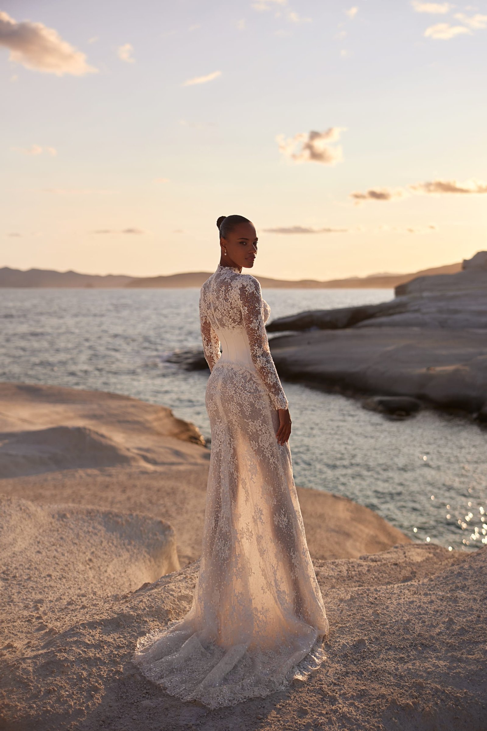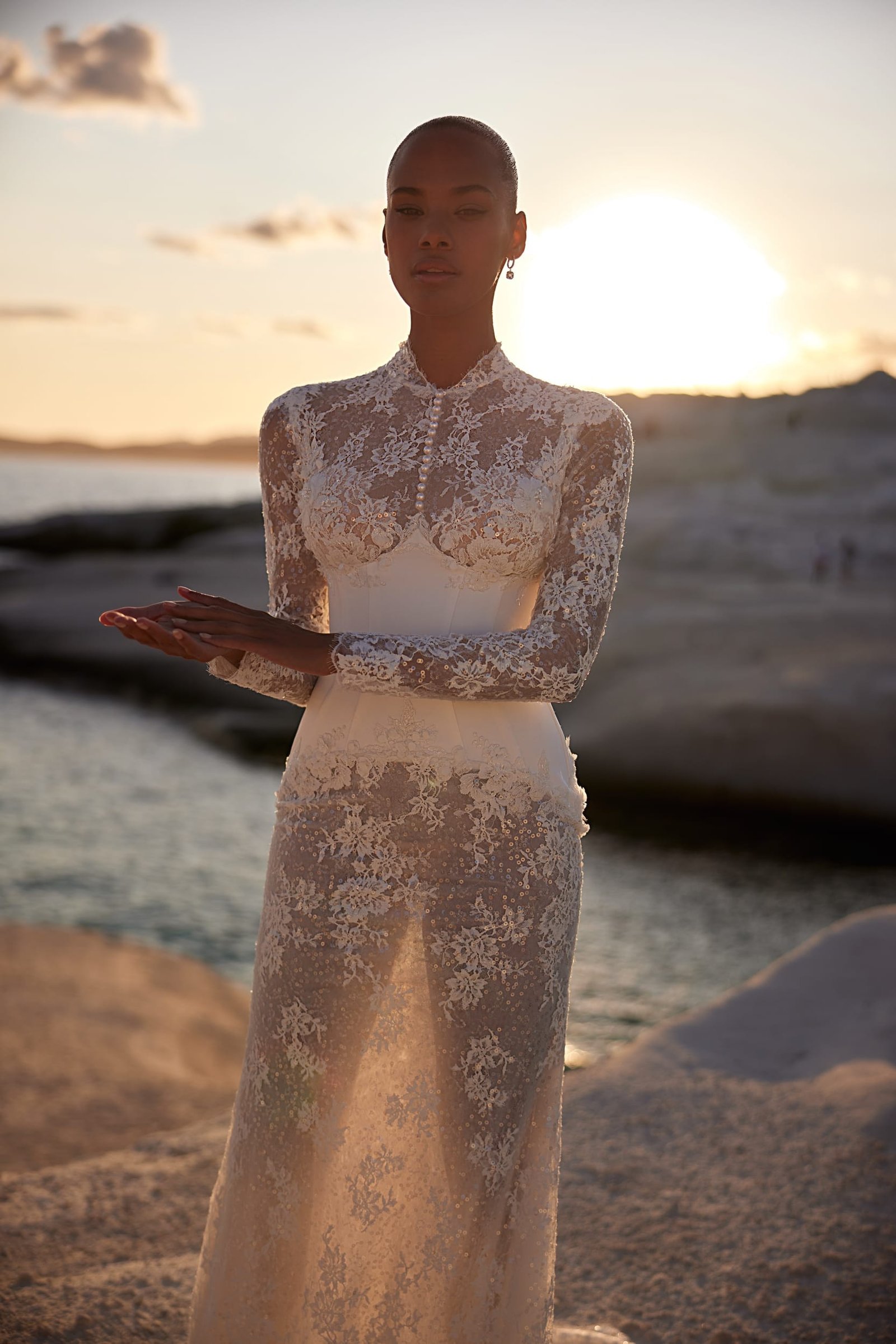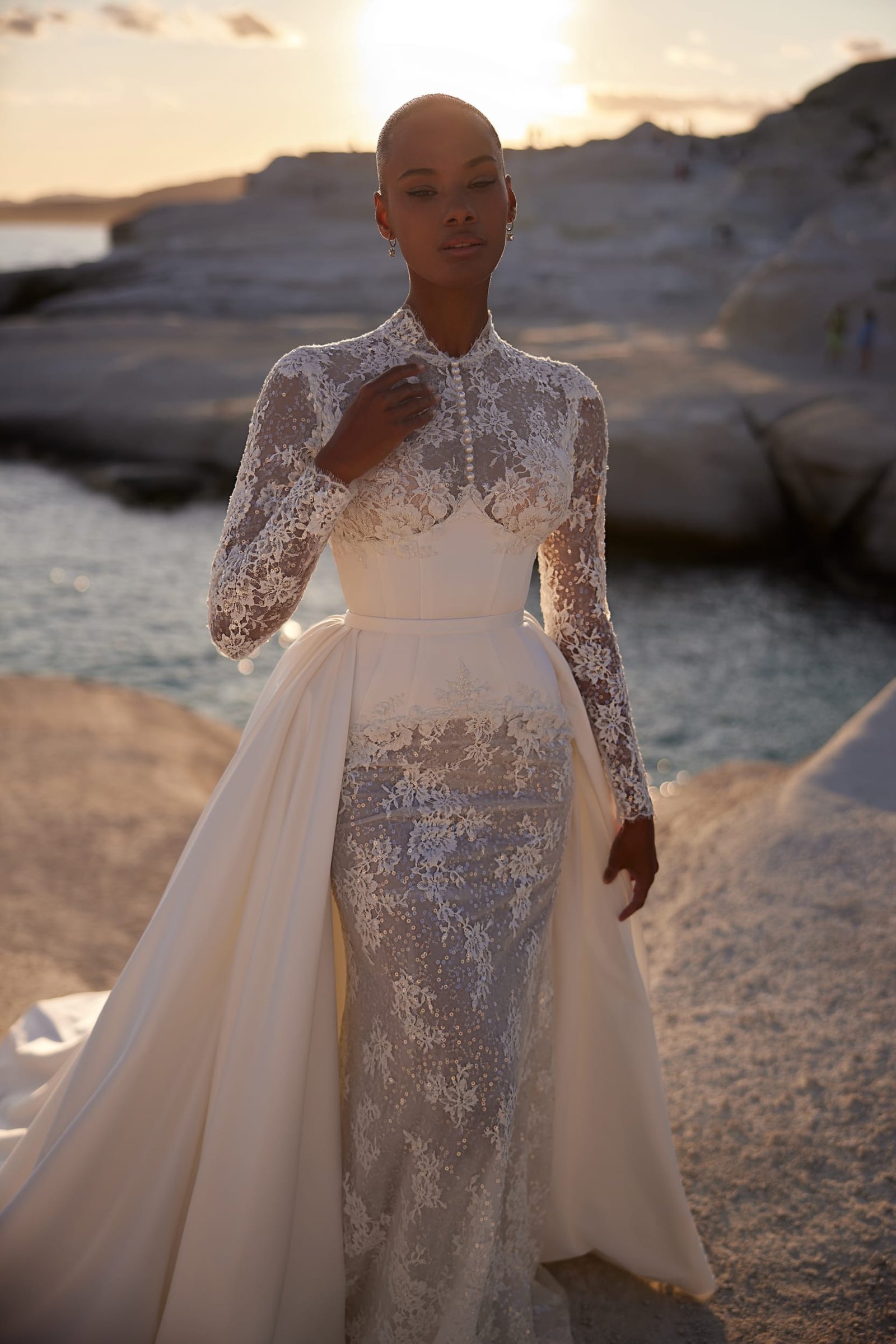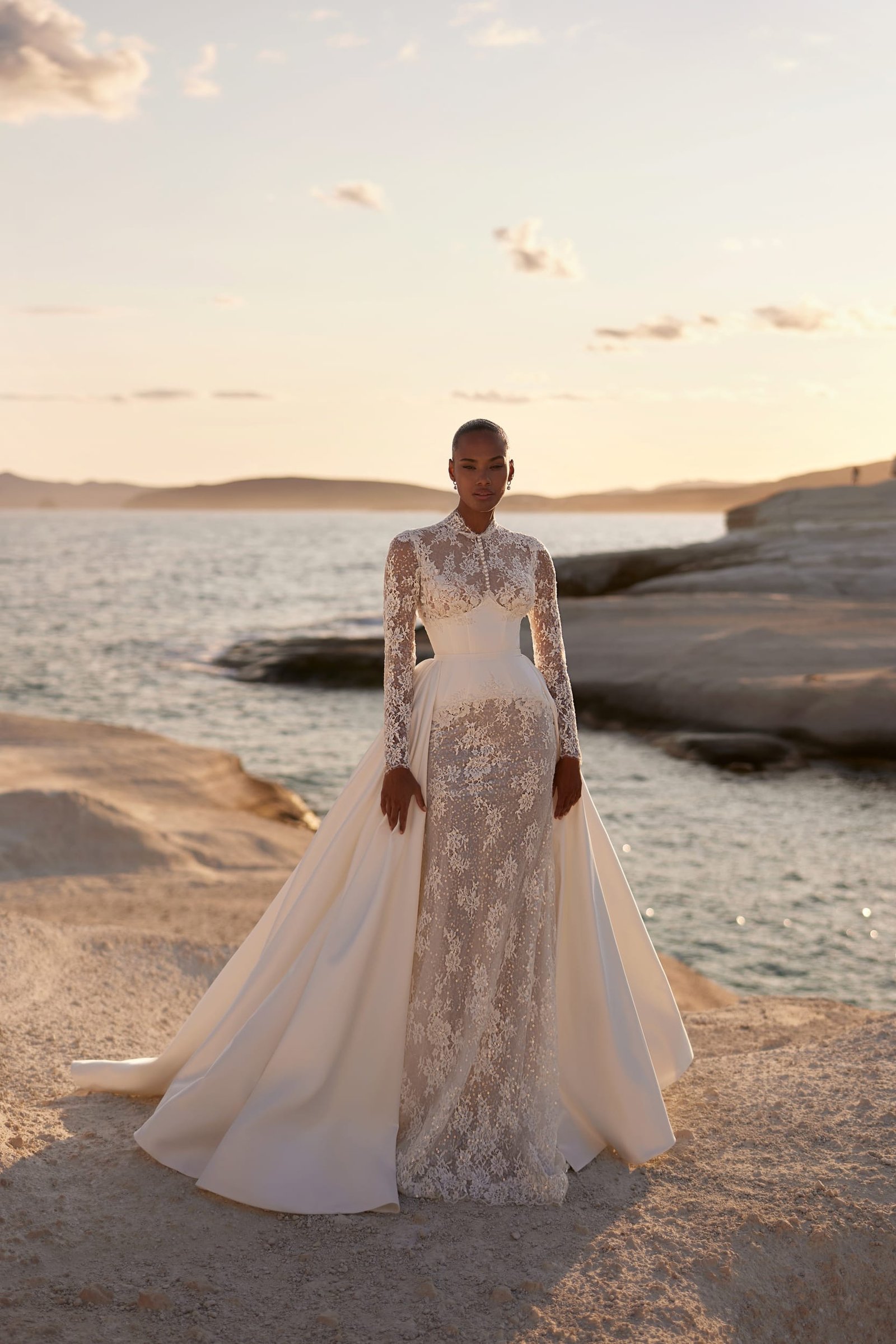Distinct and elegant gown, featuring a pointed cincher reminiscent of Victorian style. The turtleneck with long sleeves is delicately embroidered and features a pearl line down the center of the chest. The skirt consists of two layers: a semi-sheer embroidered trumpet silhouette, while the upper satin layer descends from the back, forming a train and adding a classic touch.