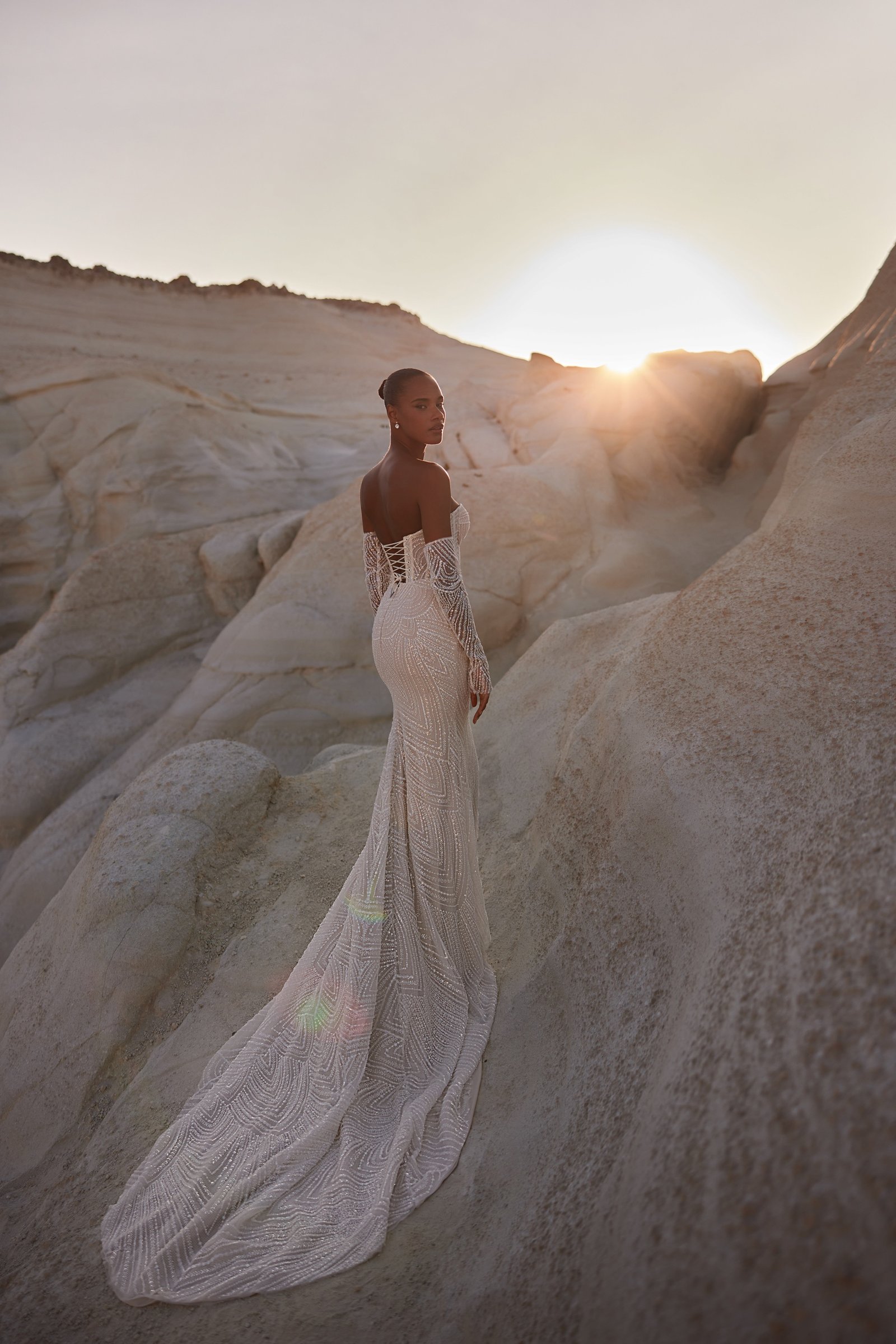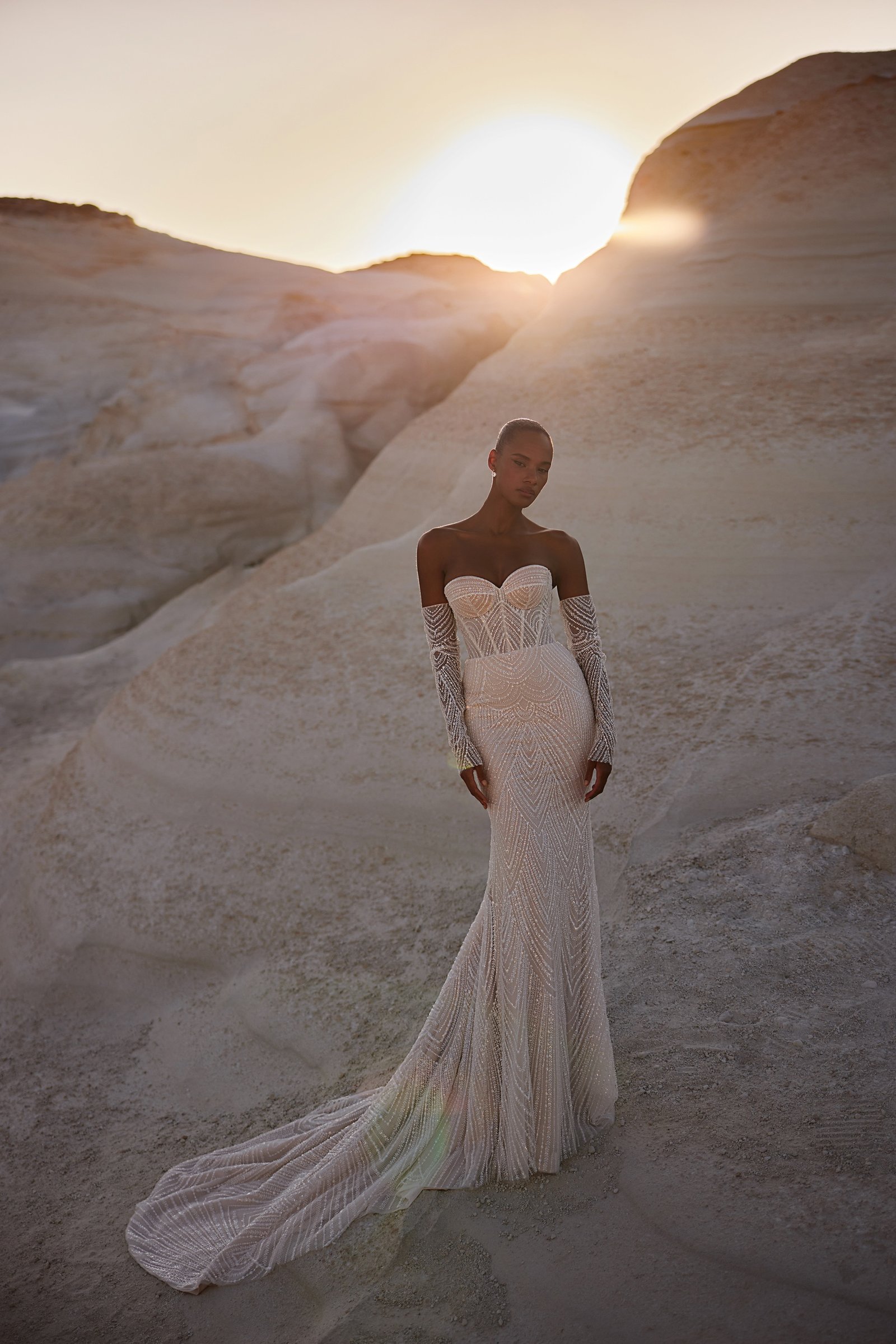 Astonishing trumpet silhouette dress with a sweetheart neckline and rich beaded embroideries forming ornamental motifs that create a luminous effect. The detachable mesh sleeves are embroidered with the same beads, while the back of the dress is complemented by a sheer train.