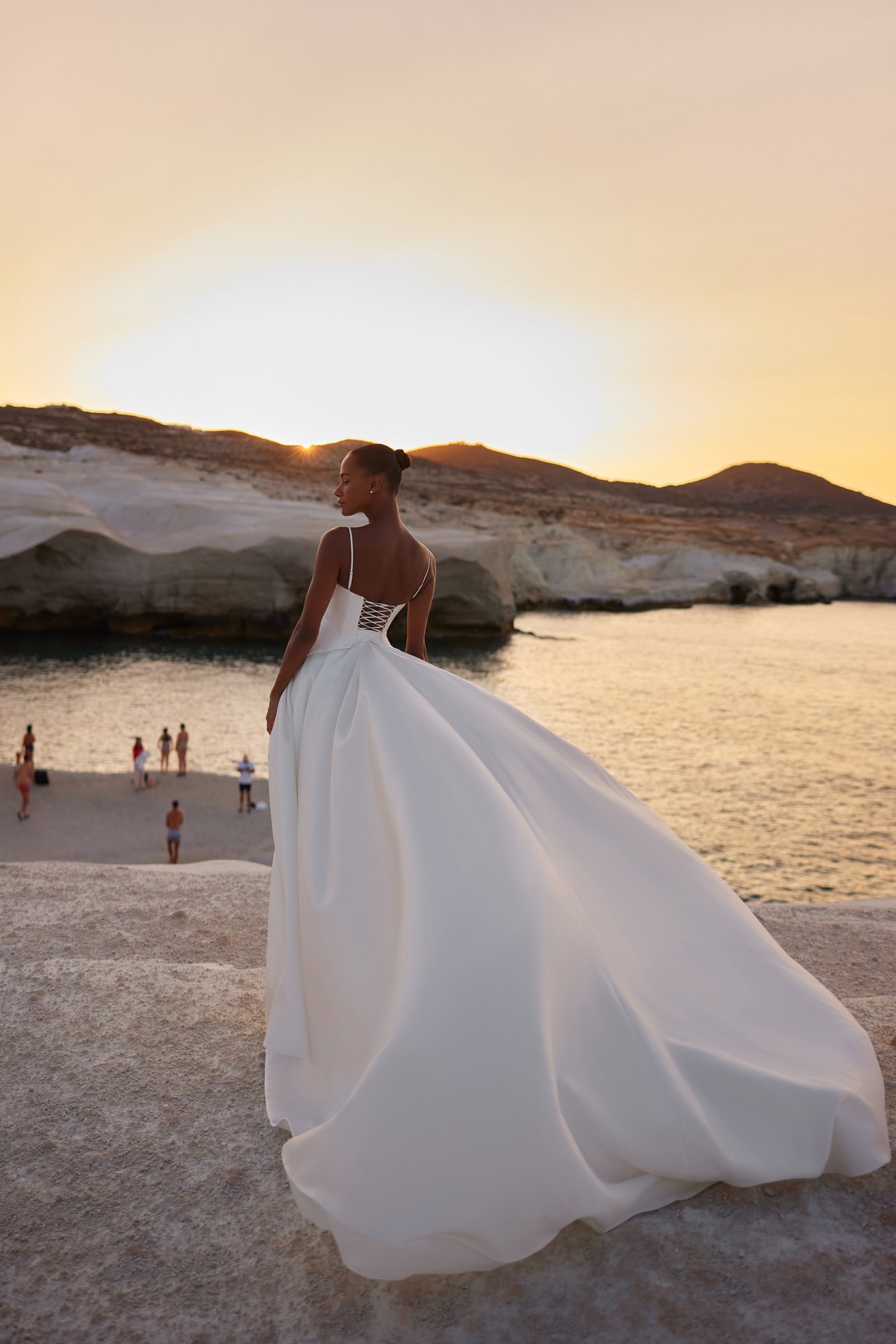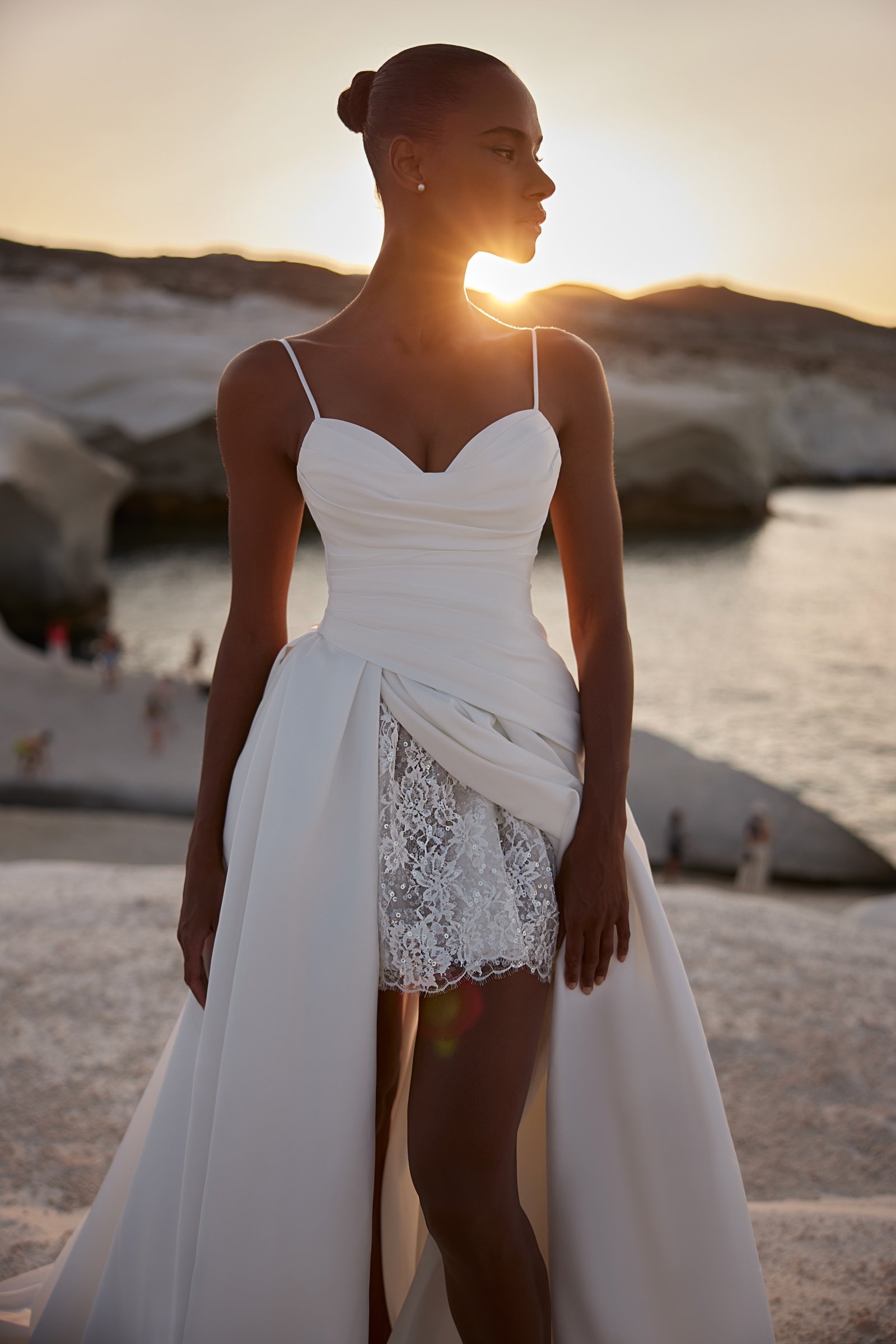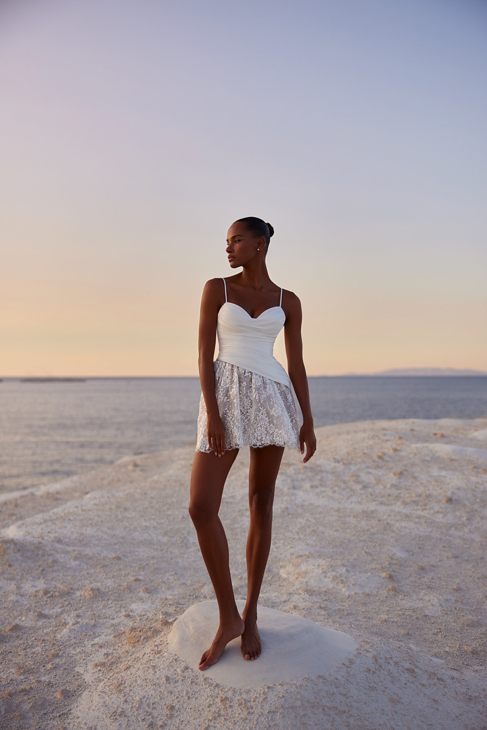 Refined strapped wrap dress featuring a sweetheart neckline. The dynamic design is created by wrapping the dress asymmetrically, giving the sensation of flowing, almost fluid fabric. The subtle lace underskirt adds a touch of tenderness to the outfit.